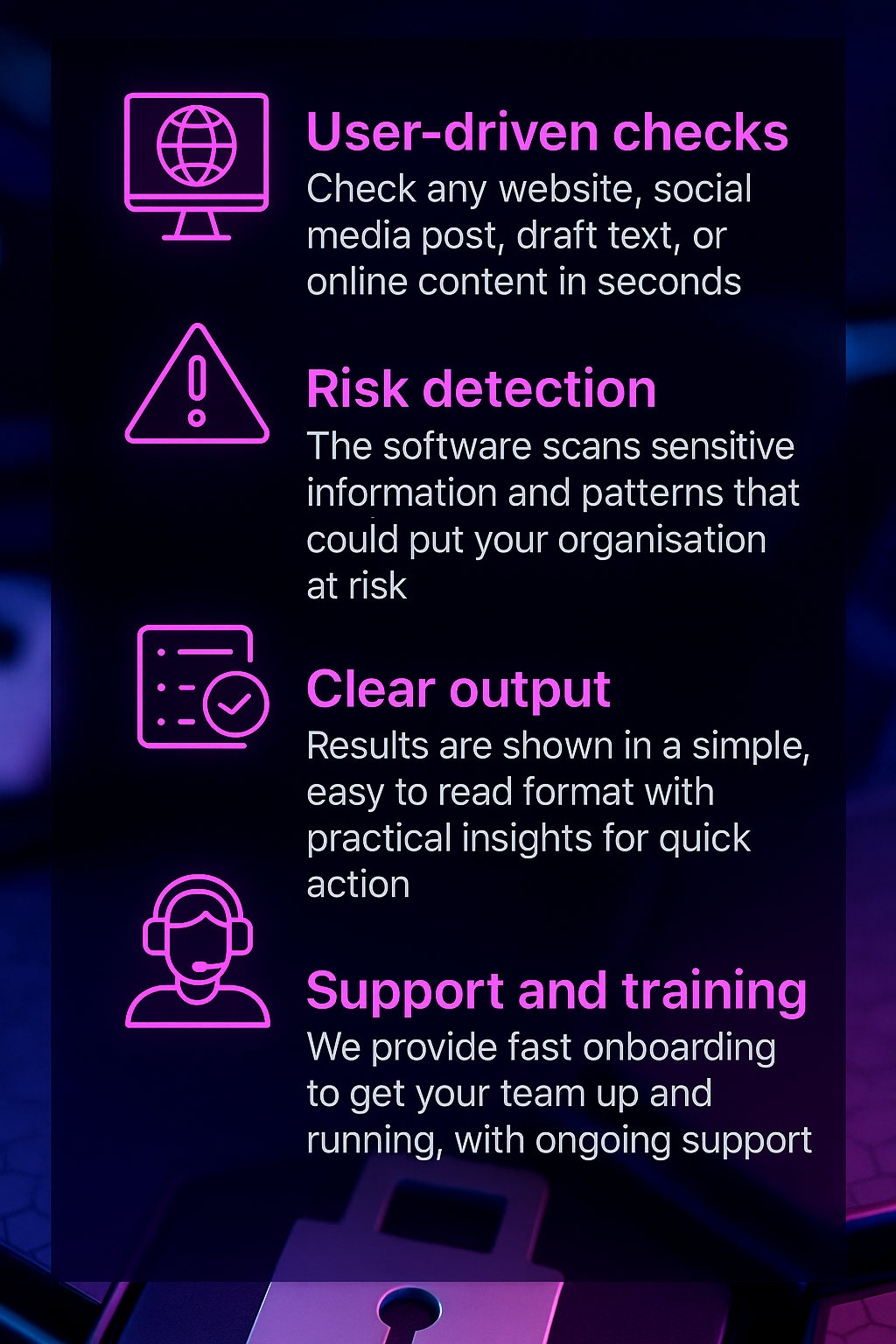 Our system highlights information and patterns that could expose your organisation to risk helping you stay ahead of adversaries and protect your people, property and reputation.